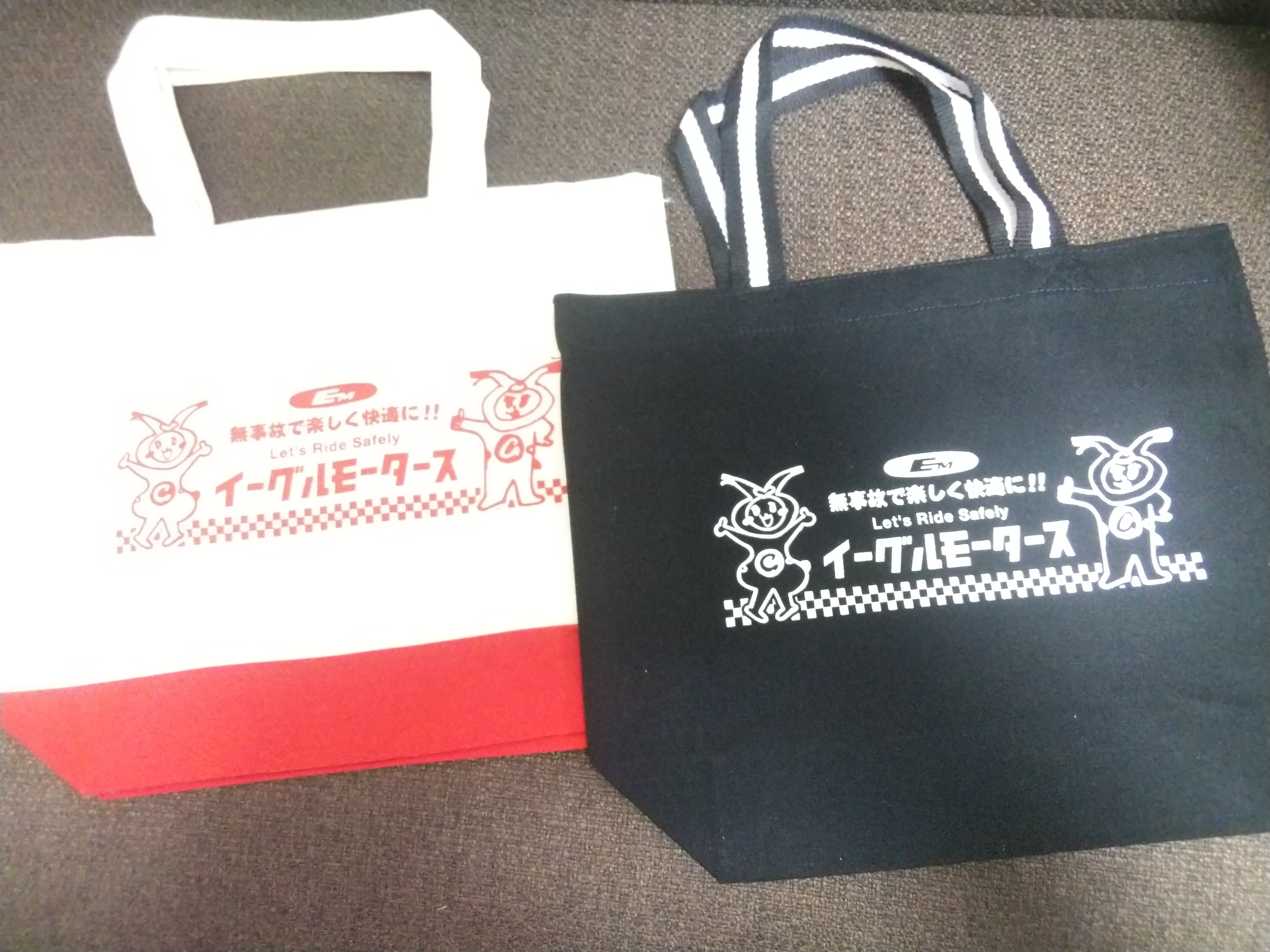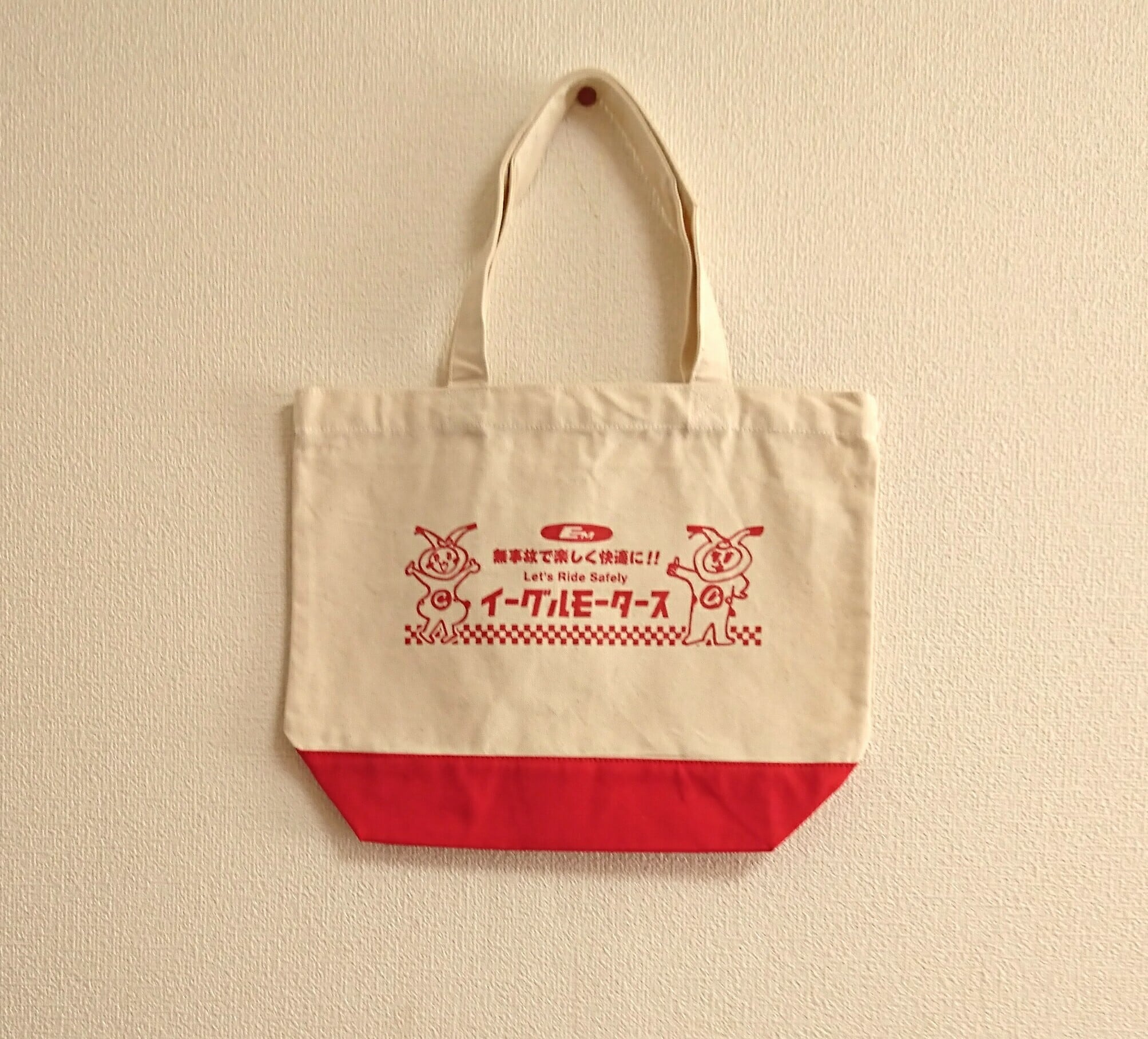 イーグルモータースのオリジナルキャラクターのイーグルカブ一郎とカブ子ちゃんがデザインされたトートバッグです。